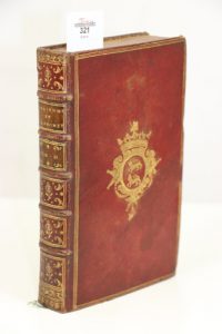 encadrement de trois filets dorés sur les plats avec armes dorées au centre, dos à nerfs orné de motifs dorés, pièces de titre et de tomaison marron, tranches dorées, [Rel. de l'époque].