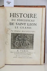MAIMBOURG (Louis). Histoire du pontificat de saint Léon le Grand. Paris, Claude Barbin, 1687 ; in-4, veau fauve moucheté, double filet doré bordant les plats, dos lisse orné, pièce de titre rouge, tranches rouges, [rel. du XVIIIe s.]. [10]...