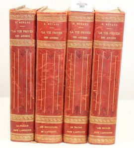 MENARD (René). La Vie privée des anciens. Tomes I-IV. Dessins d'après les monuments antiques par Cl. Sauvageot. Paris, Vve A. Morel et Cie, 1880-1883 ; 4 vol. in-8, demi-chagrin bordeaux, dos lisse orné de motifs dorés à froid, tête dorée,...