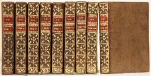 Frontispice dessiné et gravé par C . Lifen, titre entièrement gravé repris pour chaque tome, cuivre allégorique en tête de la dédicace à Madame de Pompadour, cciv, 319 p.— 464 p.— 463 p.— 463 p.— 463 p.— 449 p.— 459 p.— 460 p.— 468 p., 2 ff. de privilège.