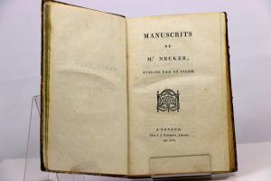 NECKER (Jacques). Manuscrits de M. Necker, publiés par sa fille. Préface de Mme de Staël. Genève, J. J. Paschoud, An XIII ; in-8, cartonnage noir d'attente, pièce de titre noire manuscrite au dos. [2] ff., 153, 354 p., [1] ff. (errata). Parmis...