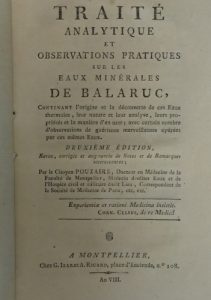 POUZAIRE. Traité analytique et observations pratiques sur les eaux minérales de Balaruc, contenant l'origine et la découverte de ces eaux thermales, leur nature et leur analyse, leurs propriétés et la manière d'en user ; avec certain nombre...