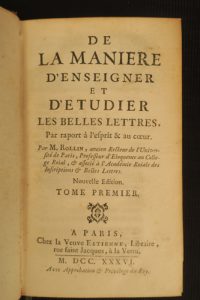 ROLLIN (Charles). De la manière d’enseigner et d’étudier les belles lettres, Par rapport à l’esprit & au cœur. Paris, Veuve Estienne, 1736 ; 4 vol. in-12, veau fauve, trois filets dorés en encadrement sur les plats, dos à nerfs ornés de...