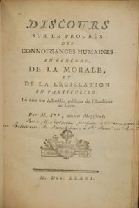 SERVAN (Michel-Joseph-Antoine). Discours sur le progrès des connoissances humaines en général, de la morale, et de la législation en particulier ; Lu dans une Assemblée publique de l'Académie de Lyon. Par M. S**, ancien Magistrat. S. l., s....
