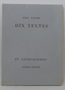 VALÉRY (Paul). Dix textes. XV lithographies [de] Georges Rohner. Paris, Aux dépens d’un groupe de bibliophiles, 1964 [1965] ; in-4 colombier, en feuilles sous couverture bleue rempliée et chemise cartonnée, étui manquant. [60] ff. Première...