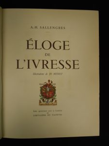 [VINS].— SALLENGRES (Albert-Henri). Éloge de l'ivresse. [Paris], Confrérie des Chevalier du Tastevin, 1945 ; in-4, demi-chagrin marron, dos à nerfs, tête dorée, couvertures et dos muets conservés. Frontispice et 6 figures hors texte à...