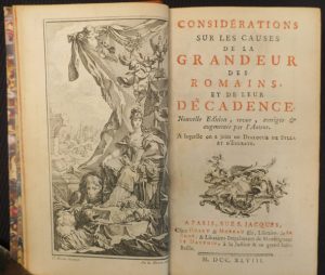 • [MONTESQUIEU]. Considérations sur les causes de la grandeur des Romains, et de leur décadence. Nouvelle édition […]. À laquelle on joint un Dialogue de Sylla et d’Eucrate. Paris, Huart & Moreau, 1748 ; in-12, demi-basane marbrée, dos lisse, tranches dorées, [rel. moderne].