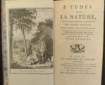 • BERNARDIN DE SAINT-PIERRE (Jacques-Henri). Études de la nature. Paris, de l’imprimerie de Monsieur, chez P. F. Didot le jeune, Méquignon, 1786 ; 4 vol. in-12, basane marbrée, dos à nerfs orné de motifs dorés, pièces de titre ocre et de tomaison vertes, tranches marbrées, [rel. de l'époque], petits accrocs.
