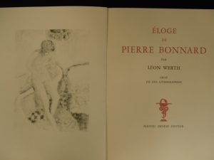 WERTH (Léon). Éloge de Pierre Bonnard. Paris, Manuel Bruker, 1946 ; in-4, broché, couverture bleu gris imprimée rempliée. Frontispice, 3 figures hors texte et 6 dans le texte, le tout lithographié par Pierre Bonnard. Tirage limité à 200...