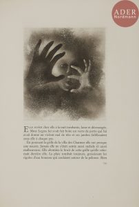 rempliée, chemise et étui de l’éditeur...L’un des ouvrages les plus rares et les plus beaux parmi ceux illustrés par Alexandre ALEXEIEFF (1901-1982). Il comprend 55 très belles eaux-fortes originales en bistre dans le texte..L’édition ne fut tirée qu’à 99 exemplaires sur vélin à la forme des papeteries de Rives, imprimée par Léon Pichon pour la typographie et par Edmond Rigal pour les eaux-fortes. .Exemplaire spécialement imprimé pour Monsieur Levi-Arnold, parfaitement conservé malgré quelques usures à l’étui.