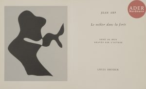 ARP (Jean)..Le Voilier dans la forêt..[Paris] : Louis Broder, [1957]. — In-16, 167 x 137 : 41 pp., (7 ff., second et 3 derniers blancs), couverture de papier japon illustré. En feuilles, couverture rempliée, chemise et étui...