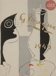 [BRAQUE (Georges)] - REVERDY (Pierre)..Braque. [Une aventure méthodique.].Paris : Fernand Mourlot, 1949. — In-folio, 442 x 323 : (2 ff. blancs), 60 pp., (28 ff. dernier blanc), couverture illustrée. En feuilles, couverture rempliée,...