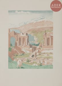 originale de ces carnets de voyage en Sicile, Rome, Sienne, Florence, Venise et Padoue, par Maurice DENIS (1870-1943). Elle est illustrée de 34 compositions en couleurs de l’auteur, gravées sur bois par Jacques Beltrand, assisté de ses frères Camille et Georges, dont 4 à pleine page, une sur le titre et 29 dans le texte..Tirage strictement limité à 175 exemplaires numérotés sur papier vélin d’Arches filigrané au titre du livre ; celui-ci, nominatif, a été spécialement imprimé pour le collectionneur et haut fonctionnaire Arthur Fontaine (1860-1931)..Exemplaire très bien conservé.