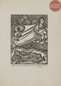 illustrée en premier tirage de 29 compositions gravées sur bois de Raoul DUFY (1877-1953), dont 4 à pleine page..Un des 35 exemplaires numérotés sur vélin blanc de Rives, avec les illustrations tirées sur les bois originaux..On joint :.GOURMONT (Remy de). M. Croquant. Paris : Georges Crès et Cie, 1918. — In-16, 165 x 114 : portrait, 114 pp., (1 f.), couverture imprimée. Broché, couverture rempliée..Belle édition illustrée d’un portrait de l’auteur en frontispice et de nombreux ornements, gravés sur bois par Raoul DUFY..Tirage à 1160 exemplaires ; celui-ci est l’un des 30 sur papier de Chine, parfaitement conservé.