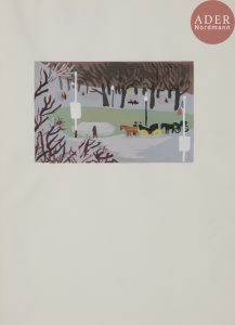 limité, de ce poème de Paul Éluard illustrant 7 gouaches de Jean HUGO (1894-1984) reproduites en tête de page et rehaussées au pochoir. Le texte est imprimé en fac-similé de l’écriture d’Éluard..Un des 948 exemplaires sur vélin pur fil, celui-ci enrichi d’une gouache originale de l’artiste..Exemplaire parfaitement conservé.