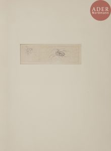 Maroquin bordeaux, grande composition sur les plats composée au centre d’un motif en V mosaïqué de box verts, rose et havane, duquel jaillissent de longs filets dorés courbes et arrondis ; dos lisse, doublures de maroquin bordeaux, gardes de velours rose, doubles gardes de papier doré, tranches dorées sur témoins, couverture et dos conservés, chemise à dos et bandes à rabats de maroquin bordeaux, étui bordé (A. Cerutti)...Belle édition publiée sur l’initiative de Henri Prost et Jules Exbrayat, tirée à 120 exemplaires sur papier vélin. Elle est illustrée de 84 pointes sèches originales d’André JACQUEMIN (1904-1992) dont une en frontispice..Exemplaire spécialement imprimé pour le docteur André Narod-Narodetzki, superbement relié par Antoinette Cerutti et enrichi de 3 dessins originaux à la mine de plomb de l’artiste pour 3 des illustrations du livre, et du menu illustré..Quelques rousseurs éparses sans gravité, plus prononcées sur le faux titre. Dos de la chemise passé.