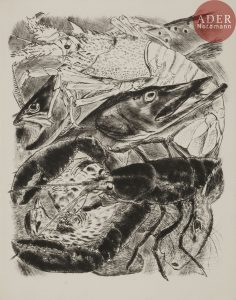 sociétés littéraires et savantes. Dans une typographie de Pierre Bouchet..Paris : Flammarion, 1951. — 2 volumes in-4, 325 x 251 : (4 ff. 2 premiers blancs), XXXVIII pp., (1 f.), 228 pp., (10 ff. dernier blanc), couverture illustrée ; (4 ff. premier blanc), 263 pp., (12 ff. 2 derniers blancs), couverture illustrée. En feuilles, couverture rempliée, chemise et étui de l’éditeur...L’un des plus beaux ouvrages illustrés par André JACQUEMIN (1904-1992), tiré à 245 exemplaires sur vélin pur fil du Marais, orné de 168 pointes sèches originales de l’artiste, dont une sur chacune des couvertures, 2 à pleine page et les autres dans le texte..C’est en ces termes que Jacquemin parla de cet ouvrage : « Henri Flammarion, qui m’avait confié, dix ans auparavant, l’illustration de «La Naissance du jour», revint vers moi avec un projet de grande envergure : illustrer la «Physiologie du goût» de Brillat-Savarin. Il s’agissait d’un ouvrage au style magnifique, un manifeste de l’art culinaire et des plaisirs de la table, doublé du savoureux recueil de mémoires d’un illustre cuisinier du XIXe siècle. Ce fut ma plus longue bataille : cinq ans de travail, cent soixante huit pointes sèches. Outre l’évocation des produits, des plats et des terroirs, je décidai de graver les grandes figures de la gastronomie de mon temps : Curnonsky, Edmond Chaix, le docteur de Pomiane, Fernand Point. » On peut ajouter à la liste des personnes représentées par Jacquemin, un portrait de Colette..UN DES 20 PREMIERS EXEMPLAIRES COMPORTANT 4 DESSINS ORIGINAUX, UNE SUITE DES POINTES SÈCHES SUR JAPON ET 15 GRAVURES REFUSÉES. Celui-ci est en plus enrichi d’une des 3 épreuves du second état de la gravure à pleine page du premier volume, numérotée et signée par l’artiste, et de 4 états (deuxième, troisième, quatrième et cinquième) signés par Jacquemin d’un des culs-de-lampe (page 71, tome 2), chaque épreuve étant justifiée 1