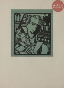 Broché...Sylvain Laboureur, Catalogue complet de l’œuvre de Jean-Émile Laboureur, II, pp. 318 à 322, n° 714..Édition originale de cette plaquette éditée par François Bernouard, tirée à 1051 exemplaires. Elle parut à l’occasion de l’arrivée à Paris du président des États-Unis Woodrow Wilson..Composée par Jean-Émile LABOUREUR (1877-1943), elle comporte 10 gravures sur bois originales sur fond de couleur, dont un bandeau sur la couverture, représentant l’arrivée du transport de troupes, et 9 portraits à pleine page..Précieux exemplaire, un des 25 premiers sur papier japon..Quelques traces de pliures et de légères salissures à la couverture, sans gravité.