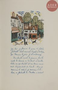 Laboureur, Catalogue complet de l’œuvre de Jean-Émile Laboureur, II, pp. 339 à 342, n° 776..Première édition séparée de ce texte issu du roman Simon le pathétique de Jean Giraudoux..Tirée à 185 exemplaires, cette édition bibliophilique reproduit le texte de l’auteur en fac-similé de son écriture en bleu accompagné de 16 lithographies en couleurs à mi-page de Jean-Émile LABOUREUR (1877-1943)..Un des 170 exemplaires sur vergé d’Arches, très bien conservé malgré de petites déchirures au dos.