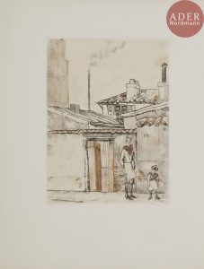 rempliée...Sylvain Laboureur, Catalogue complet de l’œuvre de Jean-Émile Laboureur, II, p. 282, n° 541bis..Édition originale de cet éloge de LABOUREUR édité par le docteur Lucien-Graux et rédigé par le Docteur Bruckner. L’illustration comprend 6 compositions de l’artiste sans rapport avec le texte mais qui étaient des travaux récents. Ainsi retrouve-t-on un frontispice gravé au vernis mou, un bandeau gravé à l’eau-forte, 3 gravures à pleine page (2 eaux-fortes et 1 burin) et un cul-de-lampe au burin..Tirage à 150 exemplaires numérotés sur vélin d’Arches..Exemplaire parfaitement conservé.