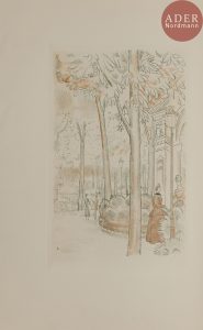 blancs), couverture imprimée. En feuilles, couverture rempliée, chemise et étui de l’éditeur...Belle édition illustrée de 50 compositions gravées au verni mou en sanguine, 25 de Jean-Émile LABOUREUR (1877-1943) pour le premier volume et 25 de Jacques BOULLAIRE (1893-1976) pour le second..Il s’agit de la dernière illustration de Laboureur qui mourut en 1943. On trouve cette précision de l’éditeur à la fin : « Le texte de la présente édition a été collationné et révisé par les soins de M. Jacques Nathan. J. E. Laboureur en avait entrepris l’illustration dès l’année mil neuf cent trente-cinq ; et les vingt-cinq planches qui figurent dans le tome premier étaient achevées en bon à tirer lorsque la mort est venue arrêter le célèbre artiste au cours de son travail. Les vingt-cinq planches du tome second ont été dessinées et gravées par Jacques Boullaire à qui l’on doit savoir particulièrement gré d’avoir su accorder sa facture et son talent personnels aux dispositions déjà prises et au style typographique de l’ouvrage »..L’édition fut publiée à 502 exemplaires imprimés en sanguine et en noir le 18 novembre 1948, jour du 26e anniversaire de la mort de Proust, avec les beaux caractères Auriol. Le copyright et le titre sont datés de 1946 alors que la couverture et l’achevé d’imprimer indiquent bien l’année 1948..Un des 440 exemplaires sur vélin pur chiffon de Lana, très bien conservé. Dos des chemises éclaircis et tachés, salissures à l’étui.
