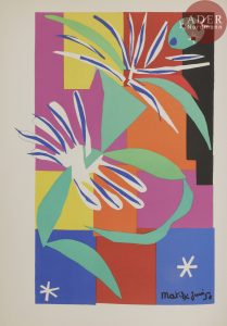 dernières œuvres de Henri MATISSE (1869-1954). Il comprend 39 lithographies de l’artiste reproduisant les œuvres en papiers gouachés, découpés aux ciseaux et collés. Elles sont accompagnées de 38 dessins reproduits en héliogravure. Matisse a composé spécialement la couverture de cet ouvrage..Exemplaire bien conservé malgré une légère déchirure à la charnière du premier plat. Manque les gardes blanches.