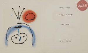 [MIRÓ (Joan)] - CREVEL (René)..La Bague d’aurore..[Paris] : Louis Broder, [1957]. — In-16, 167 x 136 : 39 pp., (8 ff. troisième et 3 derniers blancs), couverture illustrée. En feuilles, couverture rempliée, chemise et étui de...