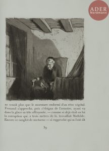 Maroquin bleu nuit, encadrement de sept filets à froid sur les plats, dos à nerfs, cuivre encastré dans la première doublure, encadré de maroquin bleu nuit orné de filets dorés, seconde doublure de maroquin bleu nuit orné d’un encadrement de filets dorés, gardes de soie moirée bleue, doubles gardes, tranches dorées sur témoins, couverture et dos conservés, chemise à dos et bandes à recouvrement de maroquin bleu nuit, étui bordé (Semet et Plumelle)...Charmante édition illustrée de 48 eaux-fortes originales de Raoul SERRES (1881-1971)..Tirage à 115 exemplaires sur papier vergé bleuté de Guarro. Celui-ci, spécialement imprimé pour Étienne Eugenidi, a été enrichi du menu illustré d’une eau-forte de l’artiste et du cuivre original pour l’illustration de la page 39, incrusté dans la première doublure..Très bel exemplaire relié par Semet et Plumelle, parfaitement conservé. Seul le dos de la chemise est passé.