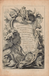 ─ PRÉVÔTS DES MARCHANDS ET ÉCHEVINS: titre particulier numéroté 5, 78 planches numérotées 6 à 83 (jusqu'en 1741 avec collettes pour 1741-1743), une planche non numérotée (1742 à 1753), 10 planches non numérotées aux écus vides (dont les 6 premières avec collettes pour 1754 à 1785).