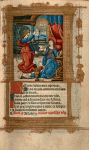 Appliquées sur les contreplats, 2 images pieuses gravées sur cuivre par Thomas de Leu (vers 1555-vers 1612), également rehaussées de couleurs à la main.
