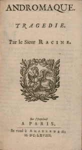 RACINE (Jean) - Andromaque. Tragédie. Sur l'imprimé à Paris, se vend à Amsterdam [impression par Abraham Wolfgang à Amsterdam], 1668. Petit in-12, 79-(1 blanche) pp. Maroquin bleu nuit, dos à nerfs cloisonné et fleuronné, triple filet...
