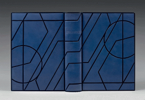 Box bleu nuit, décor géométrique mosaïqué de pièces de box bleu gris ornant les plats et le dos, titre poussé à froid au dos, doublures de daim gris bordées d'un listel de box gris bleu dans un encadrement de Maroquin bleu nuit, gardes de daim gris, couvertures et dos conservés, tête dorée, chemise à dos (avec très légères rayures) et rabats de box bleu nuit, étui bordé (C. et J.-P. Miguet - 1993).