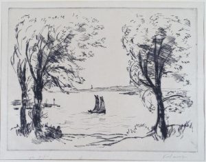 FRELAUT (Jean) - 1879-1954 - Port de Larmor-Baden - Gravure à l’eau-forte en 3 états représentant un sinagot naviguant dans le golfe du Morbihan - Signées au crayon en bas à droite dans la page -