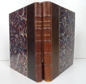 [REVUE - COLONIES] - L’Océanie française - Bulletin mensuel du Comité de l’Océanie française […] - Du n° 1 de 1911 (7ème année) au n°30 de 1913 (9ème année), soit 33 numéros reliés en 2 volumes In-4° -