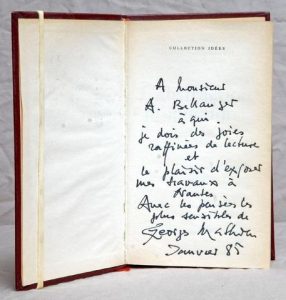 « A Monsieur A. Bellanger à qui je dois des joies raffinées de lecture et le plaisir d'exposer mes travaux à Nantes. Avec les pensées les plus sensibles de Georges Mathieu / Janvier 85. »