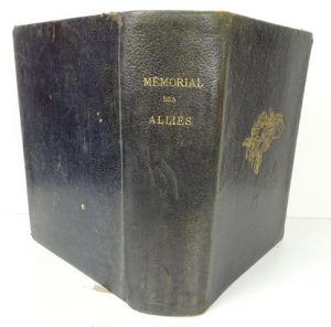 Contributions des alliés à la mémoire de la première Guerre Mondiale, avec portraits, gravures et fac-similés d'autographes - Tirage sur pur fil Lafuma - Reliure plein cuir noir (coins usés), 1er plat orné or - Dos lisse titré or - Exemplaire nominatif, pour le commandeur de la Légion d’Honneur : Monsieur Frédéric Firmenich.
