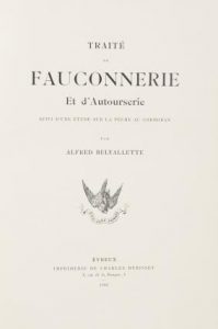 Belvallette (Alfred). Traite De Fauconnerie Et D’autourserie. Evreux, de l’imprimerie de Ch. Hérissey, 1903. Grand volume in-8 de [12]-269 pages, peau de daim, couvertures conservées, étui (Retzlaff, relieur)