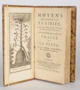 très orné (Reliure début XX°) EDITION ORIGINALE RARE ; elle est ornée d’un beau frontispice gravé sur cuivre représentant une construction imaginée par l’auteur pour la conservation du gibier. Bon exemplaire. (Thiéb., 846) (Schwerdt I, 163).
