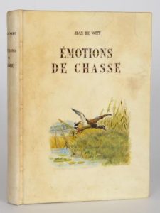 Witt (Jean de). Emotions De Chasse. Suivies de formules gastronomiques présentées par Dalbéra. Paris, libr. des Champs Elysées (1941). In-4° de186-[6] pages, velin ivoire, plat orné d’un dessin en couleurs, couvertures conservées, étui