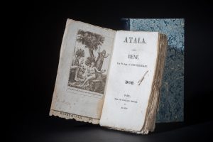 Frottements et décolorations par endroits sur les plats et au dos. 164 pp. dont faux-titre et titre, 1 bois gravé représentant Chactas et Atala en frontispice.
