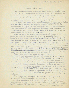 LE 20 SEPTEMBRE 1951 POUR FAIRE PART DE SA DÉSAPPROBATION ET RÉCUSER LES ACCUSATIONS DE JEAN DUBUFFET APRÈS LA DISSOLUTION DE LA COMPAGNIE ET LE TRANSFERT DES COLLECTIONS AUX ETATS-UNIS. COPIE ADRESSÉE LE MÊME JOUR À JEAN DUBUFFET.
