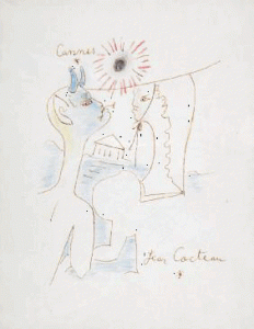 Beau dessin à l'encre rehaussé aux crayons de couleurs, situé à Cannes et signé au recto par Jean Cocteau représentant un faune séduisant une femme.