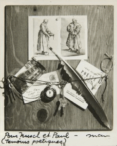 Photographie originale, tirage argentique d'époque, d'un montage réalisé par Man Ray à partir de Poésie et vérité d'Éluard et d'une enveloppe adressée à Man Ray, signé Man, et dédicacé au recto «pour Nusch et Paul (témoins poétiques).