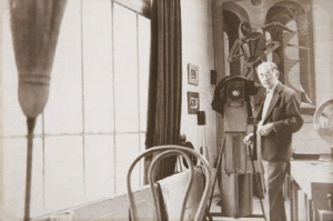 Tirage argentique d'époque représentant Man Ray dans son atelier photographiant un balai avec à la main la poire de son appareil photographique.