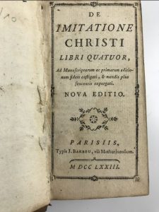 ANONYME De imitatione Christi, libri quatuor. 1 vol. in-24 relié plein veau époque, dos lisse à caissons ornés, listel d'encadrement sur les plats, tranches jaspées. Paris Barbou 1773 (Nlle éd.). 1 mors légèr. fendu, coins usés.