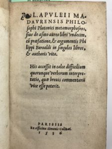 [APULÉE] L. Apuleii Madavrensis philosophi Platonici metamorphoseos. 1 vol. pt in-12 relié ½ veau, dos lisse à filets dorés. Paris Simon de Colines 1536. Mq de cuir en pied du dos, mors en partie fendu, coins frottés. Intérieur très frais.