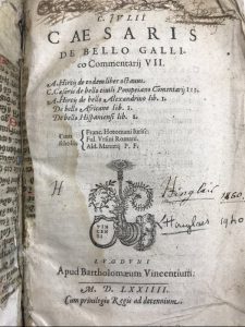 CÆSAR (Jules) De Bello Gallico commentarii VII (opéra). 1 fort vol. pt in-8 relié plein vélin à recouvrement, auteur, titre & dates manuscrites au dos. Lyon Bartholome Vincentium 1574. Mouillures claires en pied, sinon bon ex.