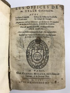 [CICÉRON] Les Offices de M. Tulle CICÉRON. 1 fort vol. in-18 relié vélin janséniste. Paris Micard 1583.
