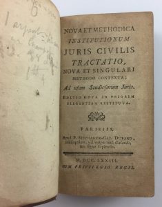 [FERRIÈRE (de)] - Juris civilis tractatio. 1 vol. in-24 relié plein veau époque, dos lisse à caissons fleuris, tranches rouges. Paris Durand 1773 (Nlle éd.).
