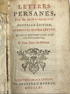 MONTESQUIEU [Mr de] - Lettres Persannes. 1 vol. pt in-8 relié plein veau époque, dos lisse à caissons fleuris, tranches jaspées. Amsterdam / Leipzig Arkstée et Merkus 1761 (Nlle éd. augm. de 12 lettres et d'une table des matières).